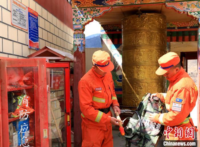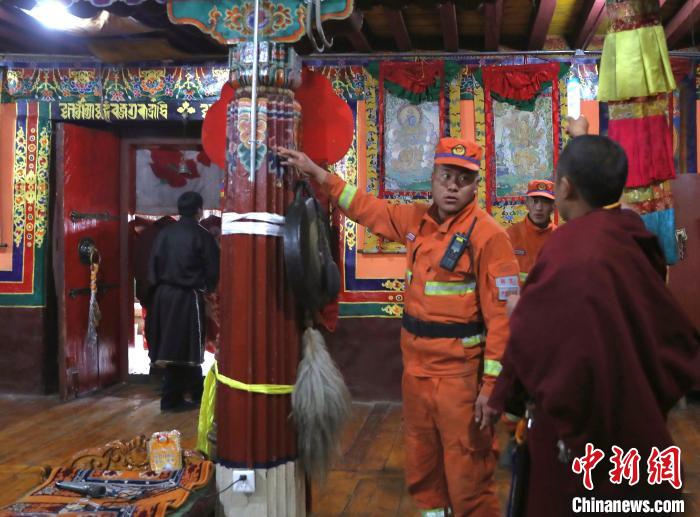 森林消防隊(duì)員檢查寺廟滅火器?!∥骼@拉翁 攝