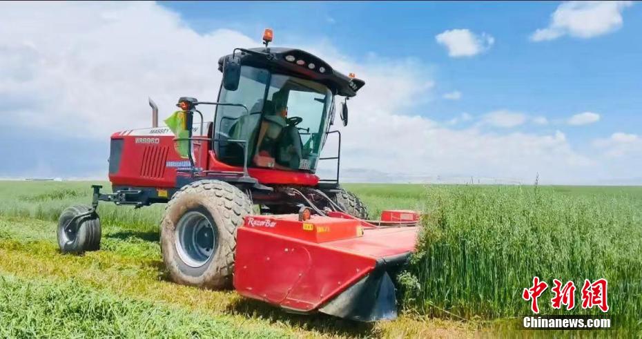 9月以來(lái),位于柴達(dá)木盆地的青海省德令哈市尕海鎮(zhèn)的萬(wàn)畝優(yōu)質(zhì)紫花苜蓿迎來(lái)收獲季。圖為收割機(jī)正在作業(yè)。