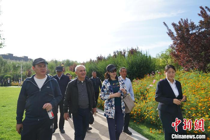 圖為兩位烏茲別克斯坦政黨代表(左一、左二)參訪西寧市北山美麗園。馬銘言 攝