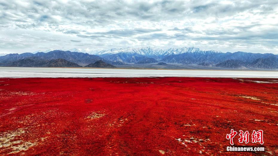 近日,在位于柴達(dá)木盆地的青海省海西蒙古族藏族自治州烏蘭縣都蘭湖國家濕地公園,岸邊的鹽生植物鹽爪爪將大地染成了紅色,黑頸鶴、斑頭雁、鵝喉羚等重點(diǎn)保護(hù)動(dòng)物在“大地紅毯”上嬉戲、覓食、休憩……攝影愛好者記錄下這美好、愜意的畫面,畫面中巨大的“紅地毯”與藍(lán)天、白云、雪山交相輝映,宛若宮崎駿筆下的童話世界。圖為鹽生植物鹽爪爪染紅了大地。