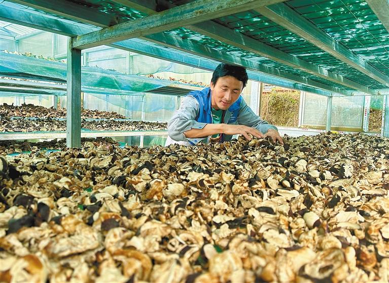 圖為林芝市墨脫縣格當鄉(xiāng)尼日卡合作社的管護人員在翻看晾曬的新鮮靈芝。郎玲 記者 王敏 攝