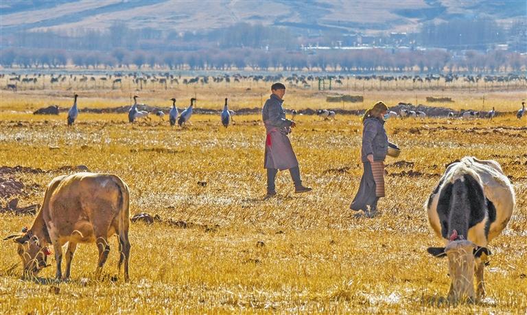 卡孜濕地是其中一個投食點(diǎn)?,F(xiàn)年43歲的洛桑次旦就住在附近,每天一大早,他都會到卡孜濕地放牧?!啊従印絹碓蕉嗔耍畮啄甑臅r間,黑頸鶴的數(shù)量從幾只增長到幾百只?!甭迳4蔚└嬖V記者,黑頸鶴和牛各吃各的,互不干擾,非常和諧。