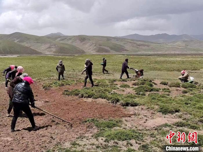 圖為牧民與企業(yè)工作人員參與阿尼瑪卿水源涵養(yǎng)與草原生態(tài)保護(hù)修復(fù)項(xiàng)目。 果洛州瑪沁縣自然資源和林業(yè)草原局 供圖