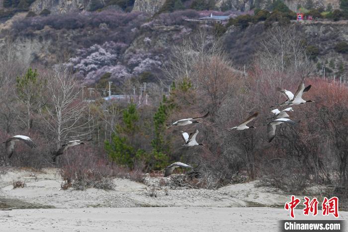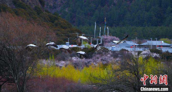 西藏林芝:黑頸鶴與雪山桃花共繪生態(tài)畫(huà)卷