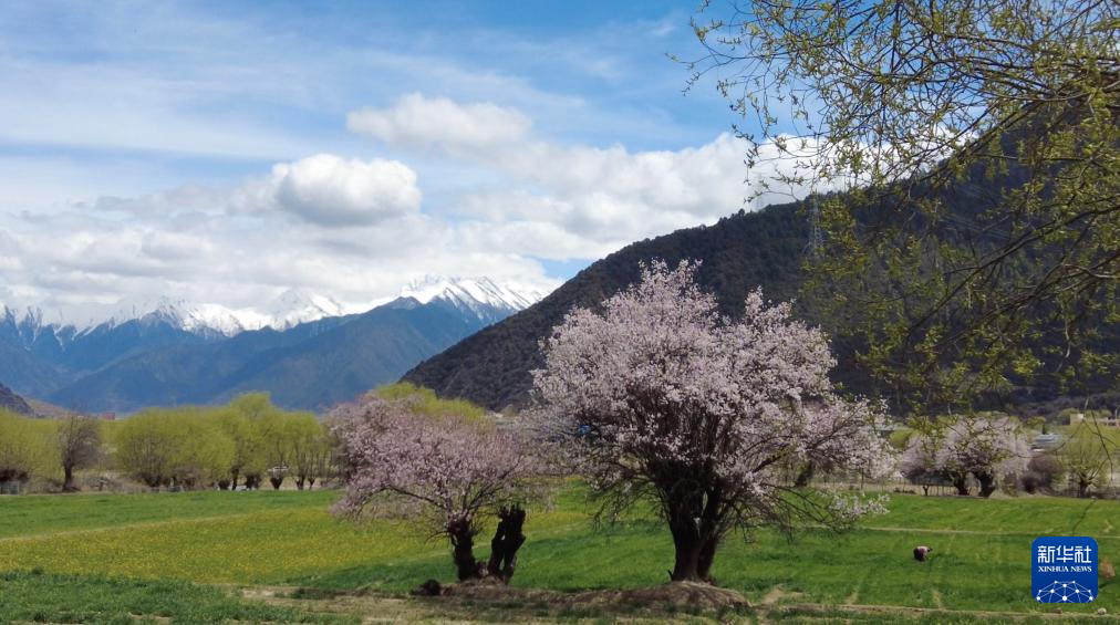 朵當村的桃花和雪山相映成趣,田間成片的青稞冒出新綠(3月30日攝)。新華社記者 邱星翔 攝