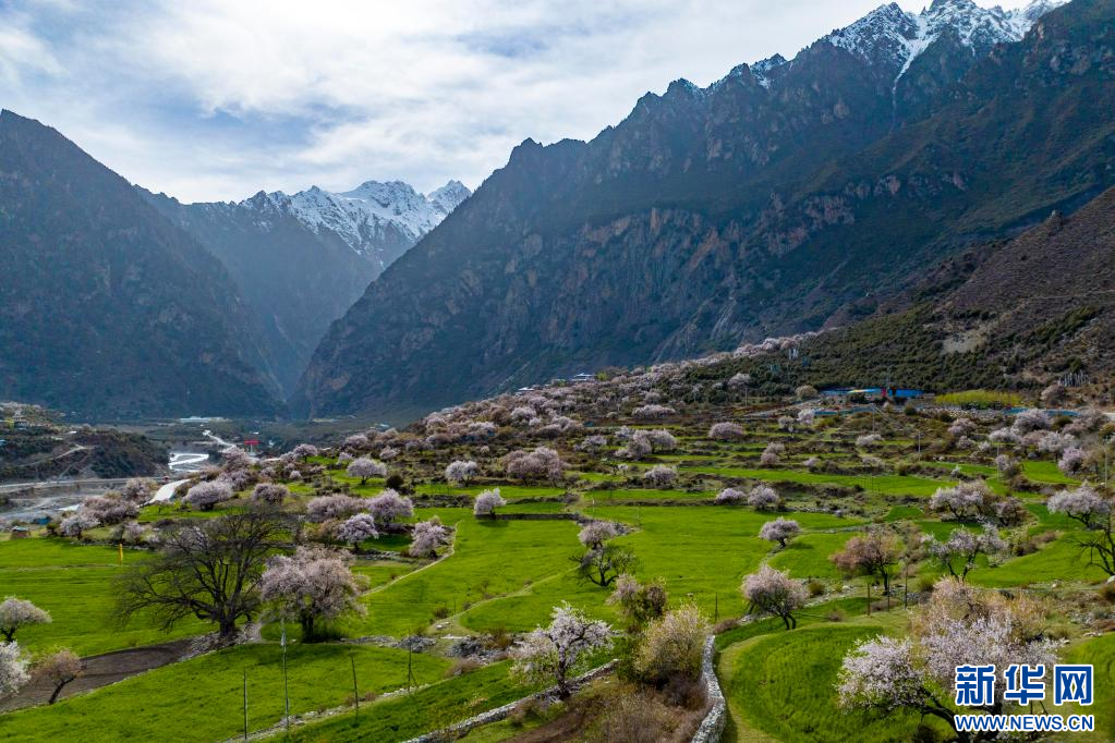 4月18日,在嘉黎縣尼屋鄉(xiāng)扎西崗村盛開的桃花(無人機(jī)照片)。新華網(wǎng) 旦增努布 攝