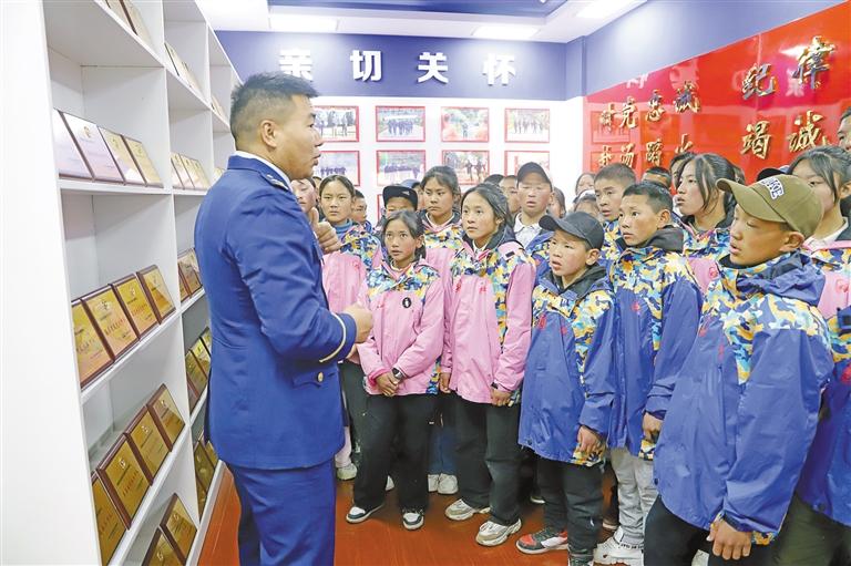圖為消防員為師生們講解隊(duì)伍榮譽(yù)。記者 貢秋曲措 攝