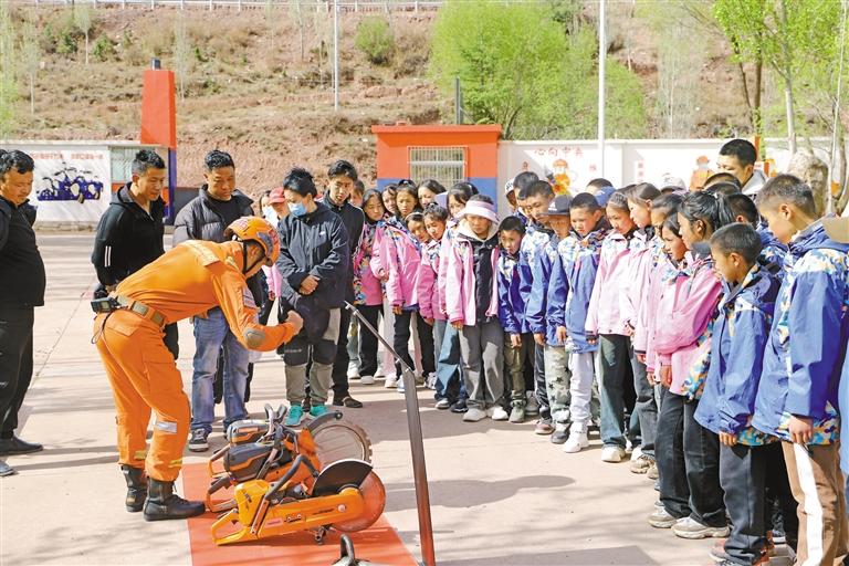 圖為消防員為師生們介紹各類裝備。記者 貢秋曲措 攝