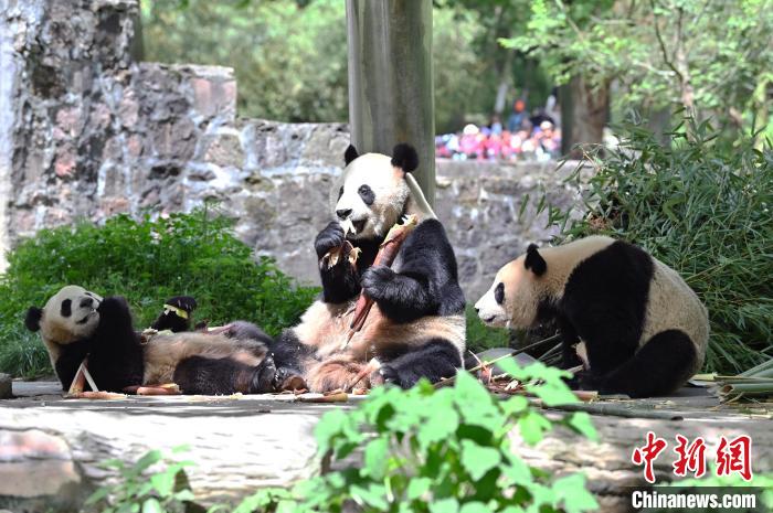 4月21日,中國大熊貓保護(hù)研究中心都江堰基地的大熊貓享用美食,憨態(tài)可掬。中新社記者 安源 攝