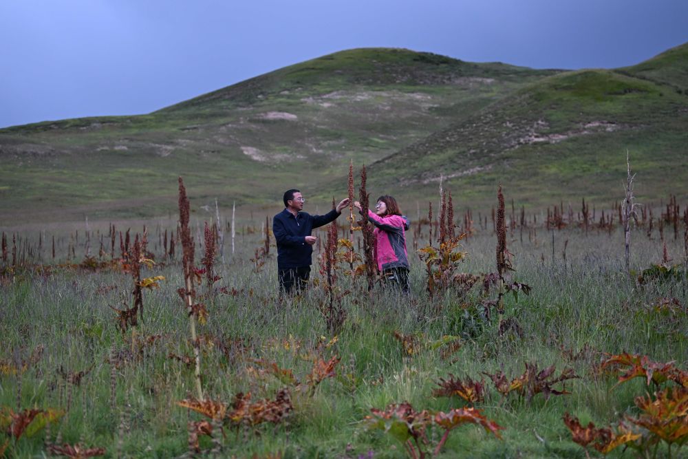 2023年9月5日,科技工作者在青海省果洛藏族自治州一處“草藥間種”的黑土灘治理試驗(yàn)田中收集唐古特大黃種子。新華社記者 張龍 攝