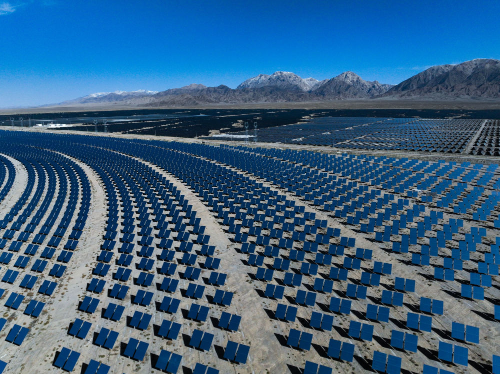 345平方公里的發(fā)電園內(nèi),超過1000萬(wàn)塊光伏板高低起伏連成蔚藍(lán)色的“海洋”,年發(fā)電量超過200億千瓦時(shí),相當(dāng)于減排二氧化碳超過2122萬(wàn)噸。