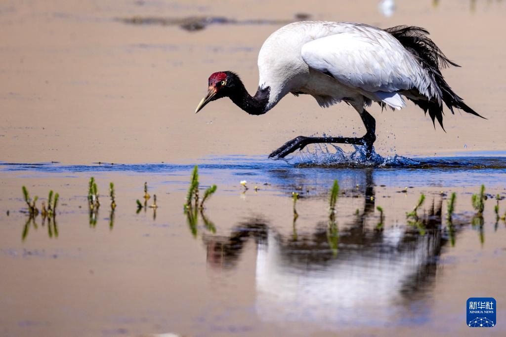 6月9日,一只黑頸鶴在西藏那曲市申扎縣一處濕地棲息、覓食。新華社記者 姜帆 攝