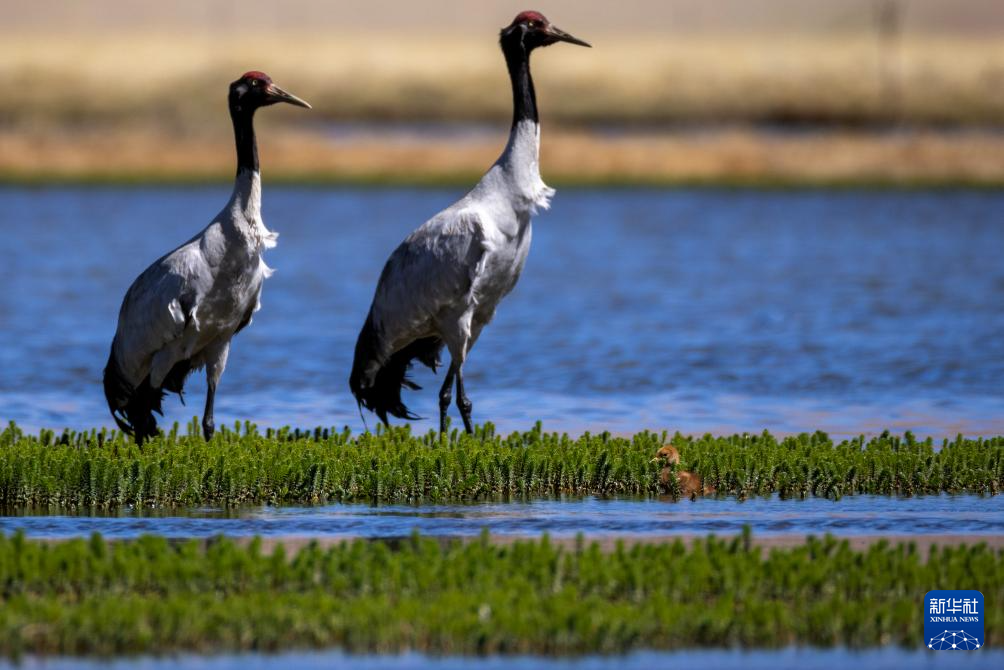 6月9日,一對黑頸鶴夫婦帶著雛鳥在西藏那曲市申扎縣一處濕地棲息、覓食。新華社記者 姜帆 攝