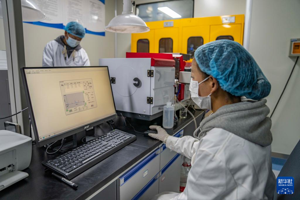 在聶榮縣嘎確生態(tài)畜牧業(yè)發(fā)展有限責(zé)任公司,檢驗員達(dá)娃卓瑪在檢測奶制品(5月13日攝)。新華社記者 孫非 攝