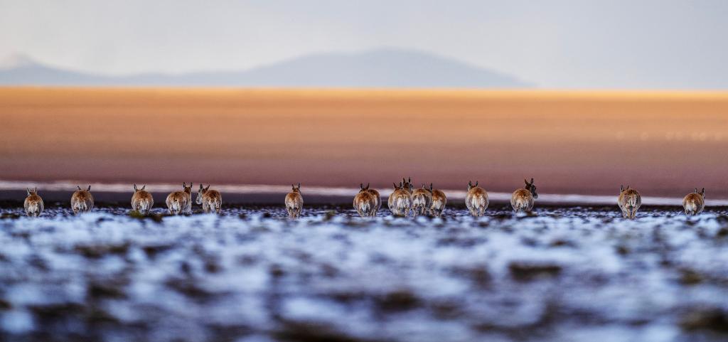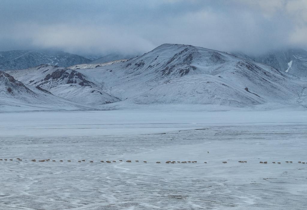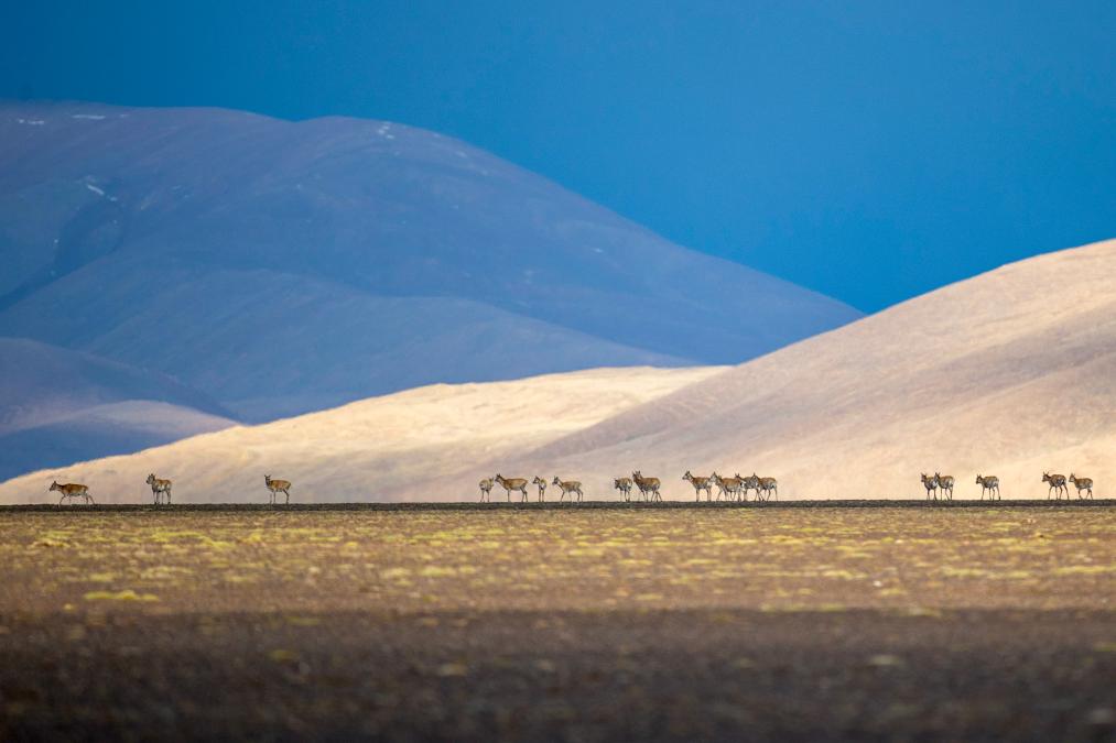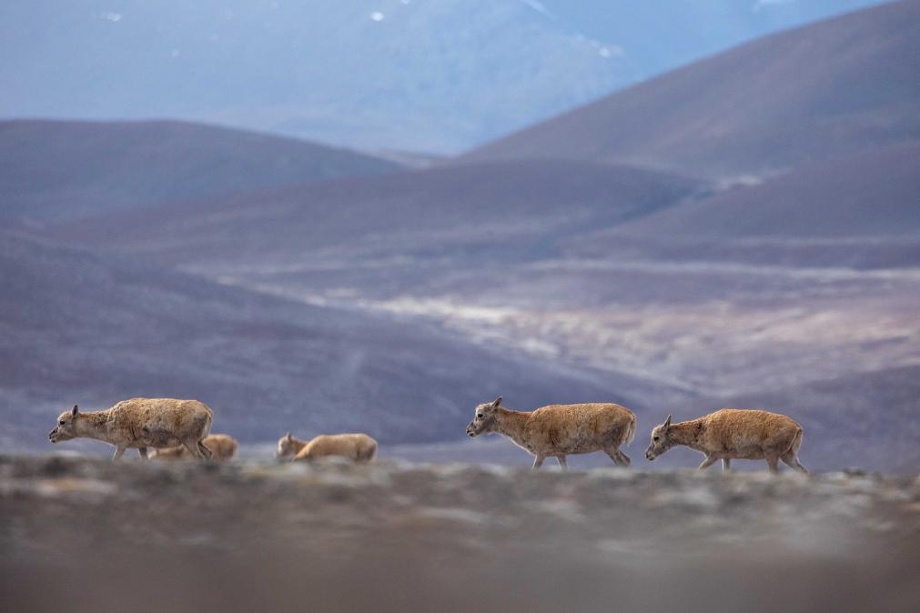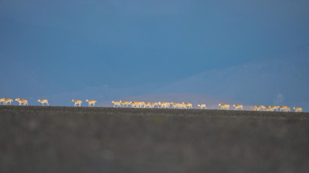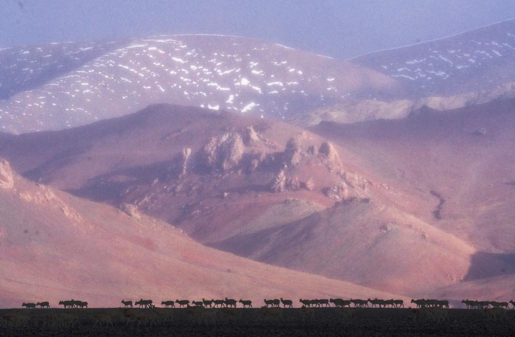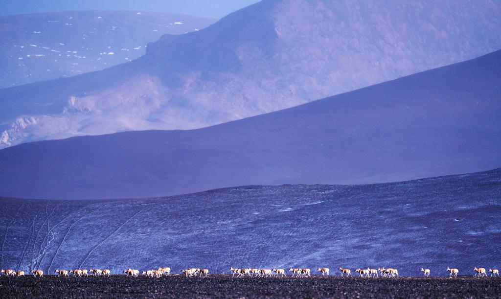 6月15日清晨在羌塘國家級(jí)自然保護(hù)區(qū)拍攝的遷徙中的母藏羚羊。
