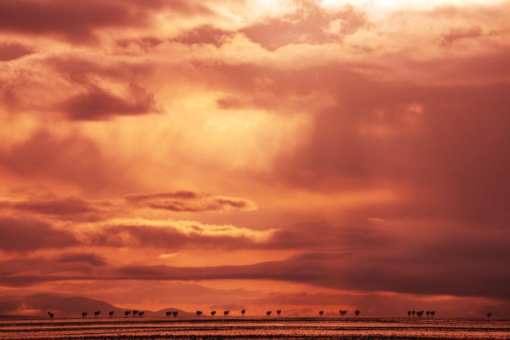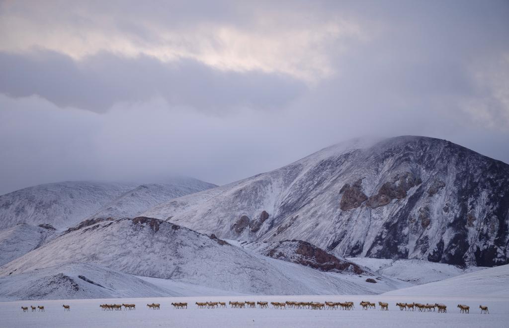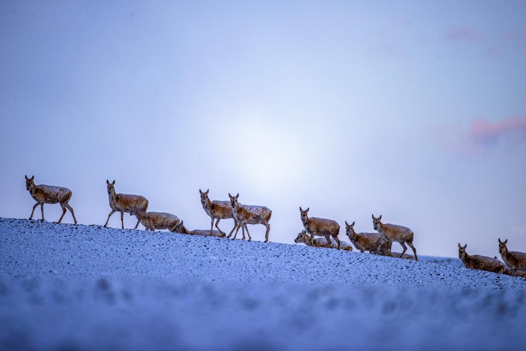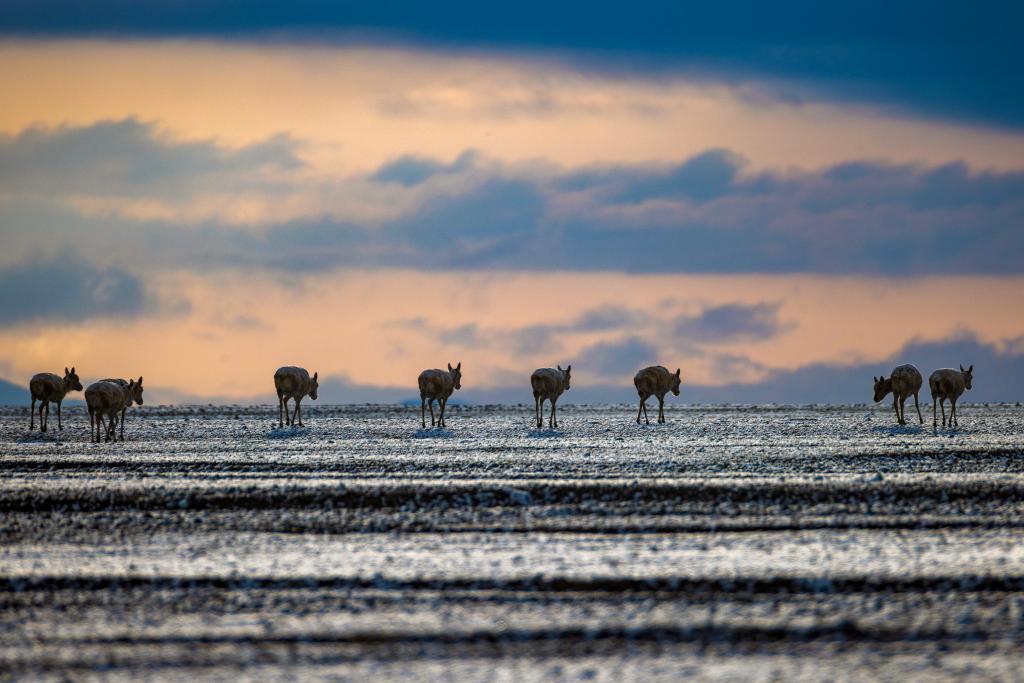6月15日清晨雪后,在羌塘國家級(jí)自然保護(hù)區(qū),迎著朝霞前行在遷徙路上的一群藏羚羊。