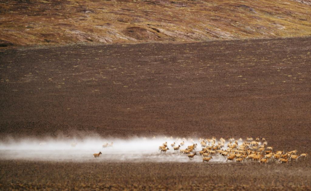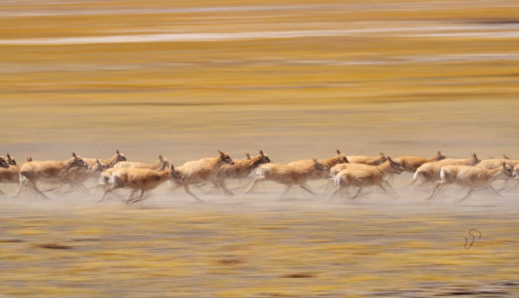 6月13日,在羌塘國家級(jí)自然保護(hù)區(qū),遷徙中的藏羚羊奔跑起來。