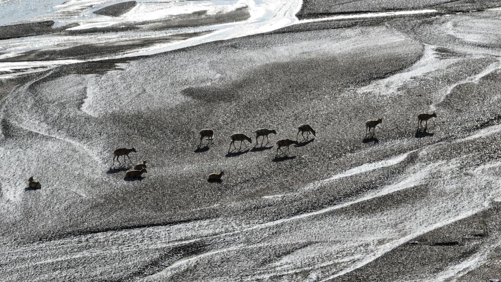 大群遷徙的藏羚羊途徑甜水河畔的荒灘雪地,向產(chǎn)羔地遷徙(6月15日攝)。
