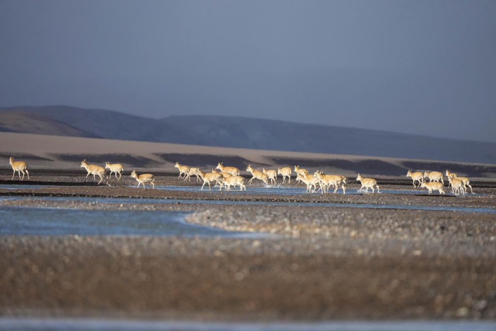 6月13日傍晚,在羌塘國家級(jí)自然保護(hù)區(qū),遷徙中的母藏羚羊越過甜水河。