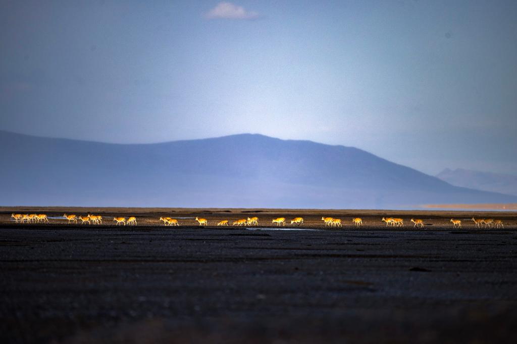 6月13日傍晚在羌塘國家級(jí)自然保護(hù)區(qū)拍攝的遷徙中的藏羚羊。