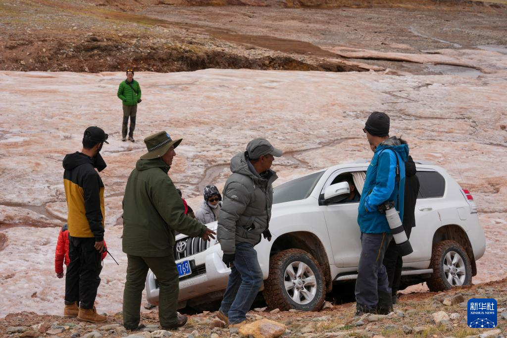 6月15日,車(chē)輛在羌塘國(guó)家級(jí)自然保護(hù)區(qū)內(nèi)過(guò)冰坡遇困。新華社記者 旦增尼瑪曲珠 攝