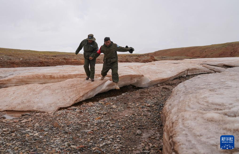 6月15日,羌塘國(guó)家級(jí)自然保護(hù)區(qū)野生動(dòng)物專(zhuān)業(yè)管護(hù)隊(duì)員索朗(右)和羅布檢查河面冰凍情況。新華社記者 費(fèi)茂華 攝