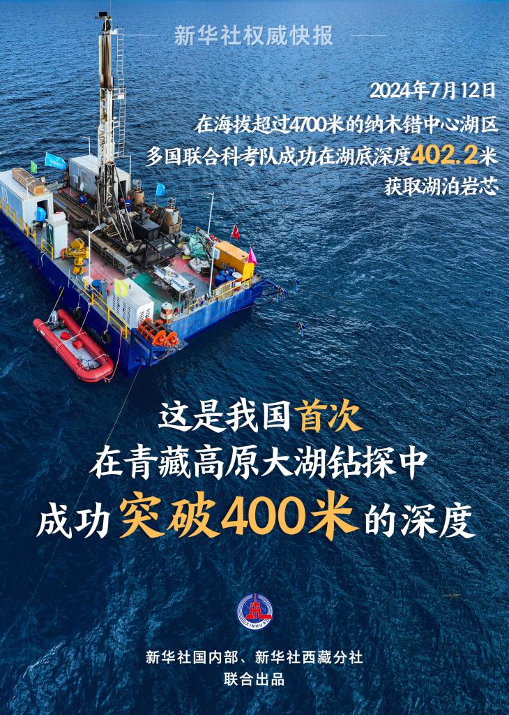 7月12日18時(shí)35分,水上鉆探平臺(tái)鉆機(jī)轟鳴,卷?yè)P(yáng)機(jī)拉緊鋼繩,高達(dá)14.3米的鉆塔,將層層包裹的湖泊巖芯打撈出來(lái)。這是我國(guó)首次在青藏高原大湖鉆探中成功突破400米的深度獲取巖芯,打破了2020年納木錯(cuò)湖泊鉆探153.44米的鉆探紀(jì)錄。