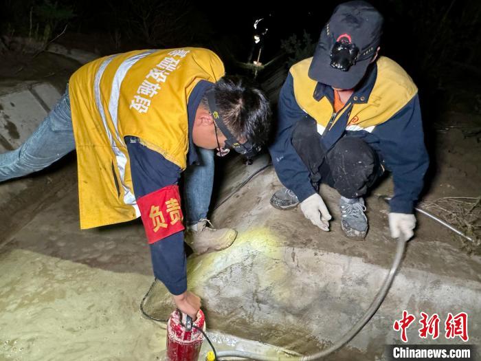如墨的夜色下,經(jīng)過2個小時的連續(xù)抽水,排水溝的大部分積水被抽出,職工們頭戴照明燈,手握鐵鍬一字?jǐn)[開,開始深一腳淺一腳,清理溝底淤泥,道道搖曳不定的光柱,在靜默的夜空下閃爍交織。