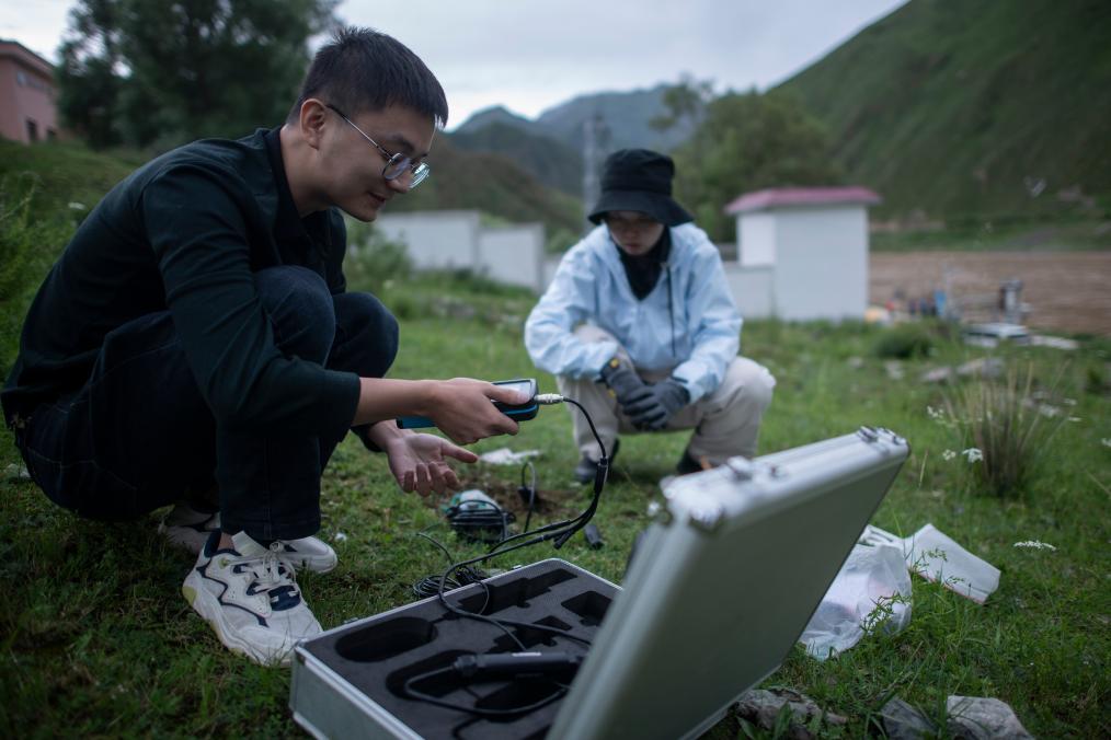 7月20日,在直門達(dá)水文站,長江科學(xué)院空間信息技術(shù)應(yīng)用研究所廖茂昕(左)和付珺琳進(jìn)行土壤多參數(shù)檢測。新華社記者 伍志尊 攝
