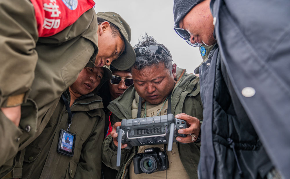 2024年5月10日,在西藏羌塘國家級自然保護(hù)區(qū),羅布玉杰管護(hù)站站長格桑倫珠(右二)和隊(duì)員們在大雪中操作無人機(jī)觀察藏羚羊遷徙情況。