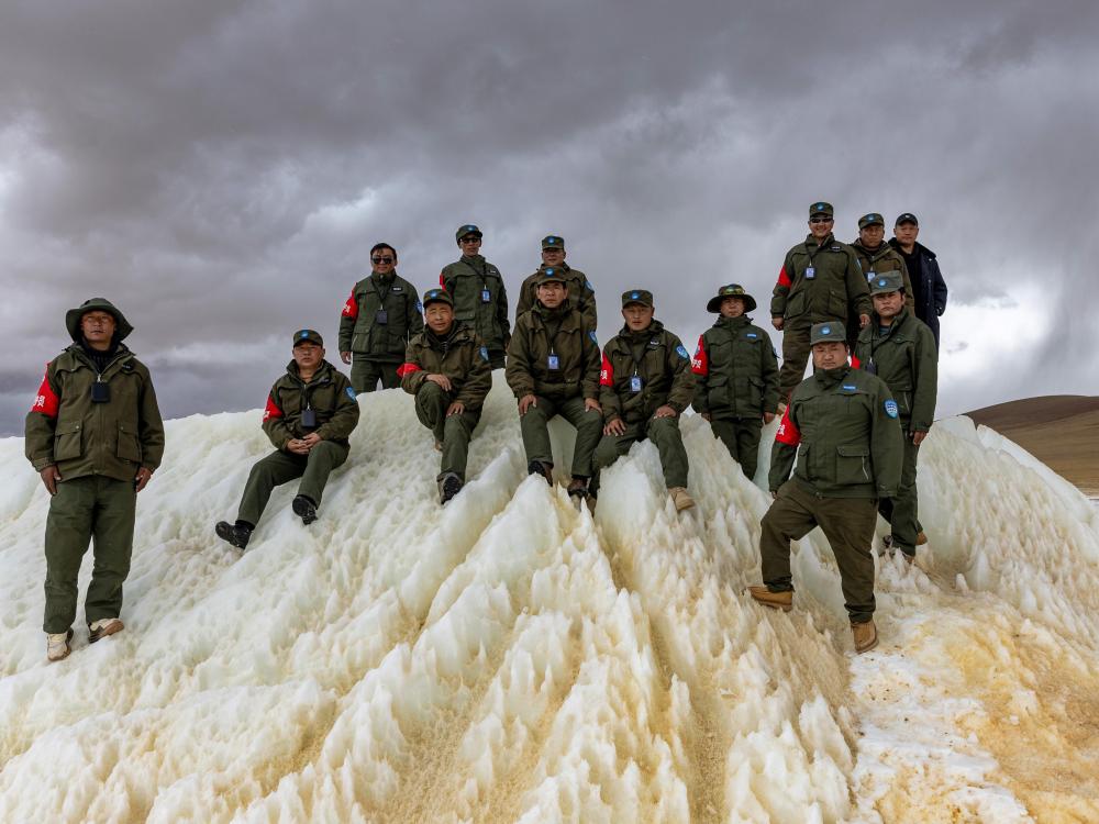 2024年5月7日,在西藏羌塘國家級自然保護(hù)區(qū),野生動物專業(yè)管護(hù)隊(duì)員在巡護(hù)路上一處埡口的冰雪堆上合影。