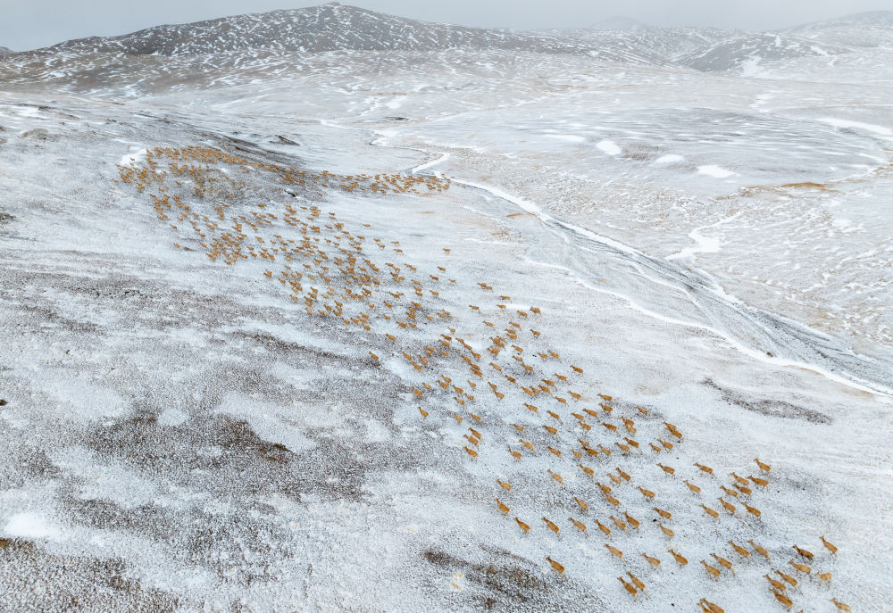 2024年6月15日清晨雪后,在西藏羌塘國家級自然保護(hù)區(qū),一群藏羚羊迎著朝霞前行在遷徙路上。