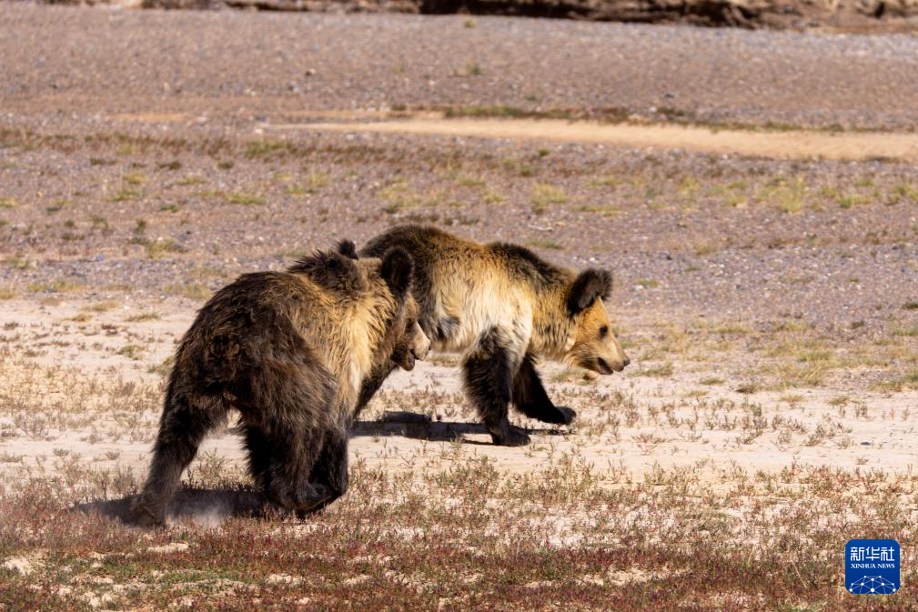 在西藏那曲市尼瑪縣的羌塘國家級自然保護(hù)區(qū)核心區(qū),被放歸的棕熊母子走向大自然(8月30日攝)。新華社記者 姜帆 攝