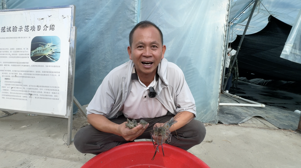 林芝農(nóng)墾嘎瑪農(nóng)業(yè)有限公司副總經(jīng)理駱明飛展示剛捕撈上來的鮮蝦。新華社記者王洪流 攝
