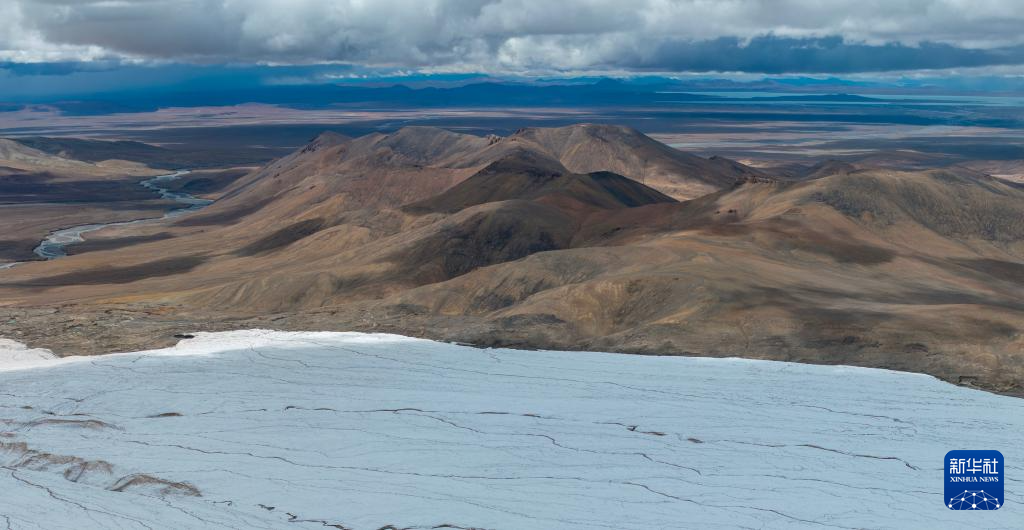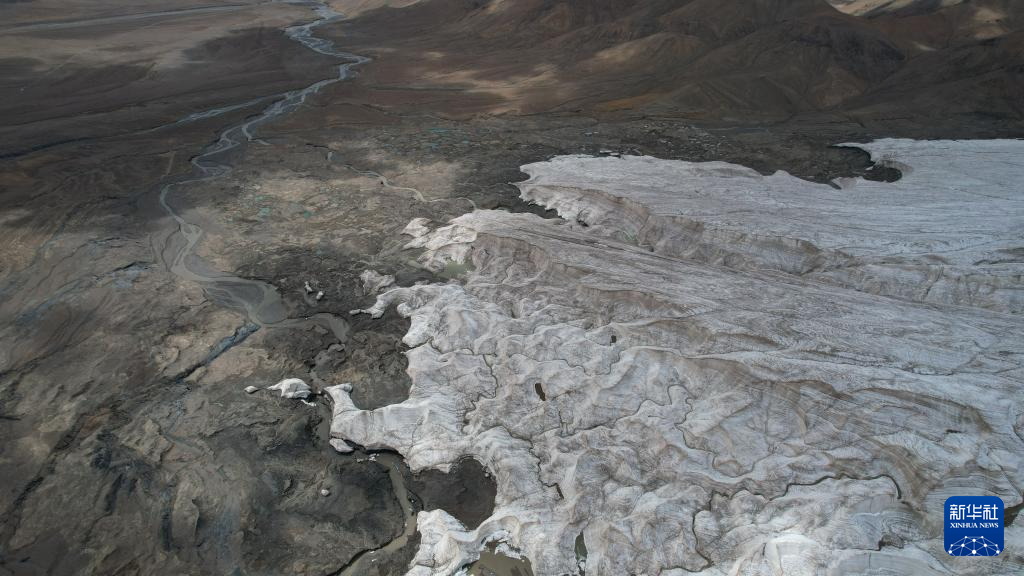 這是9月4日拍攝的普若崗日冰原8號(hào)冰川、消融形成的徑流以及遠(yuǎn)處的令戈錯(cuò)(無(wú)人機(jī)拼接照片)。新華社記者 姜帆 攝