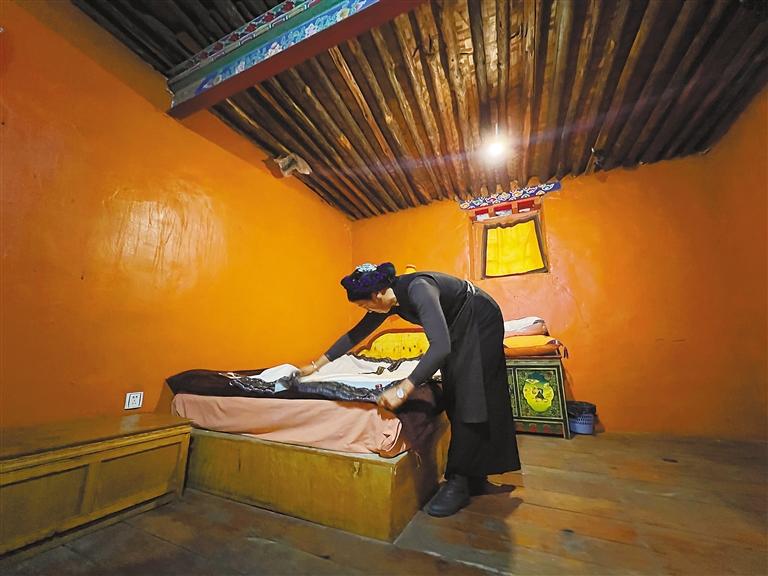 扎西頓珠的妻子在進行客房清潔。