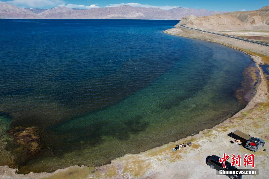 10月4日,游客在班公湖邊休閑露營?!笆弧眹鴳c假期,不少游客來到西藏日土縣班公湖游玩。(無人機照片)