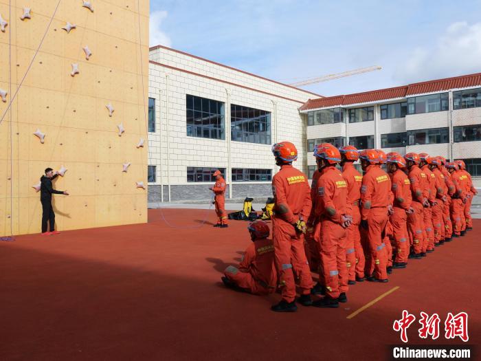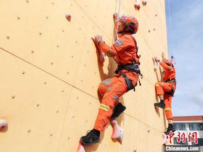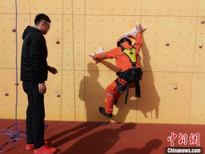 圖為訓(xùn)練中,教員指導(dǎo)消防員攀巖技巧。扎西頓珠 攝