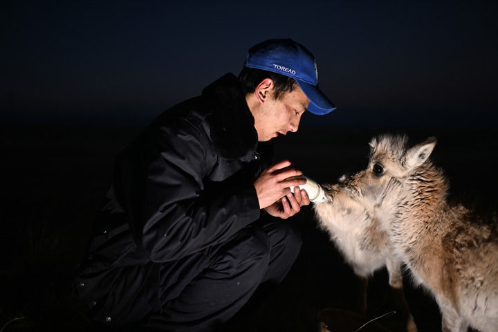 可可西里巡山隊(duì)隊(duì)員才文多杰在索南達(dá)杰保護(hù)站內(nèi)給被救助的藏羚羊幼仔喂奶(2024年1月18日攝)。新華社記者 張宏祥 攝