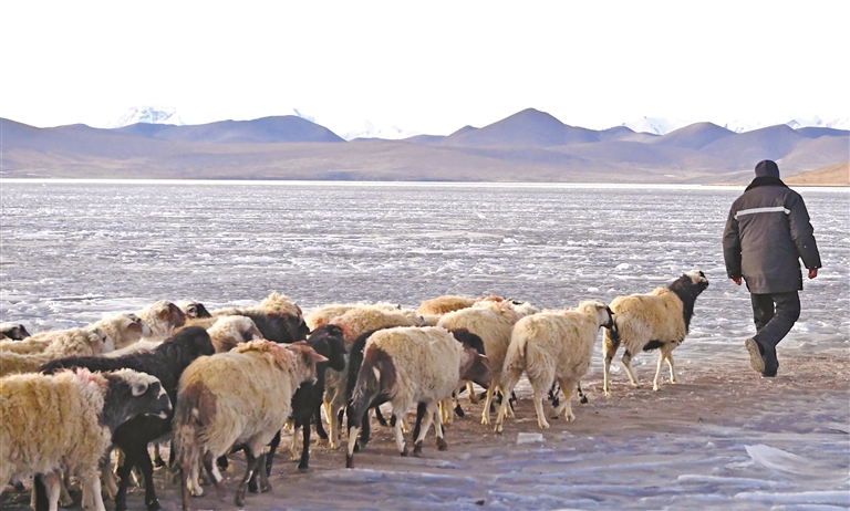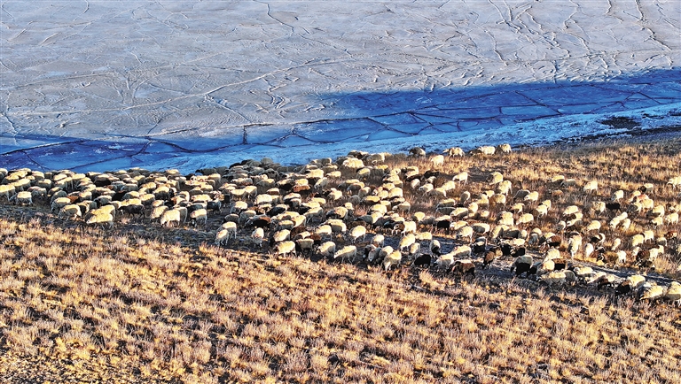 朝陽下,羊群在牧民和民警的保護下前往湖心島牧場。(圖片均由記者 旦增蘭澤 平措次仁 晉巴次成 武沛濤 攝)