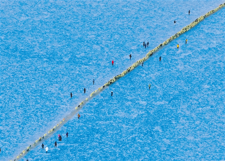 清晨,當?shù)谝豢|陽光灑在冰面上,牧民便開始了他們的旅程。穿著傳統(tǒng)服飾的老爺爺帶頭驅(qū)趕著羊群踏上冰面。羊群沿著爐灰鋪成的小路緩緩前行,宛如一條長長的金色線條,在藍冰上勾勒出一幅亮麗畫卷。途中,偶爾會有小羊因冰面濕滑而摔倒,牧民總是及時將它們扶起,或背或抱地送到島上。