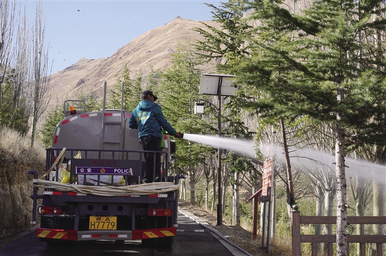 在南山公園,記者看到工人們正忙著給樹澆水。南山公園安保人員扎西次旺告訴記者:“雖然我是負(fù)責(zé)安保工作的,但是我不忙的時候也會去給樹澆水,因?yàn)檫@里的每一棵樹、每一株草對于我們而言都有非常大的意義。通過大家的努力,我相信我的家鄉(xiāng)會變得越來越綠,生態(tài)環(huán)境也會越來越好?!?/p>