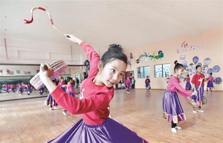 5月4日,西藏自治區(qū)青少年宮在拉薩揭牌。圖為孩子們在西藏自治區(qū)青少年宮內(nèi)學(xué)習(xí)藏族傳統(tǒng)熱巴舞。 新華社記者 覺 果攝