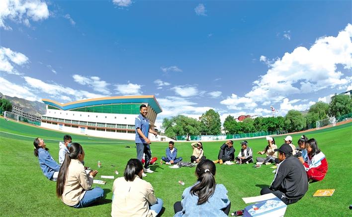 圖為拉薩中學(xué)高三(4)班班主任次旦朗加組織學(xué)生們參加課外活動,幫助大家釋放壓力,調(diào)整心態(tài),為考生們加油助威。記者 潘多 攝