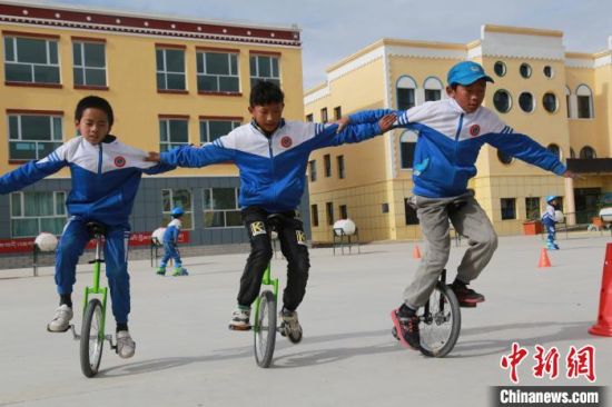 圖為鄉(xiāng)村學(xué)校少年宮的孩子們正在騎獨輪車?!〔抛尡?攝