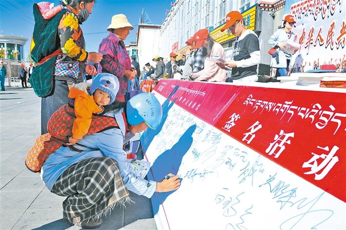 獅泉河鎮(zhèn)群眾在“民族團結(jié)月”簽名板上簽下自己的名字。 溫凱 洛桑旦增 扎西羅布 攝