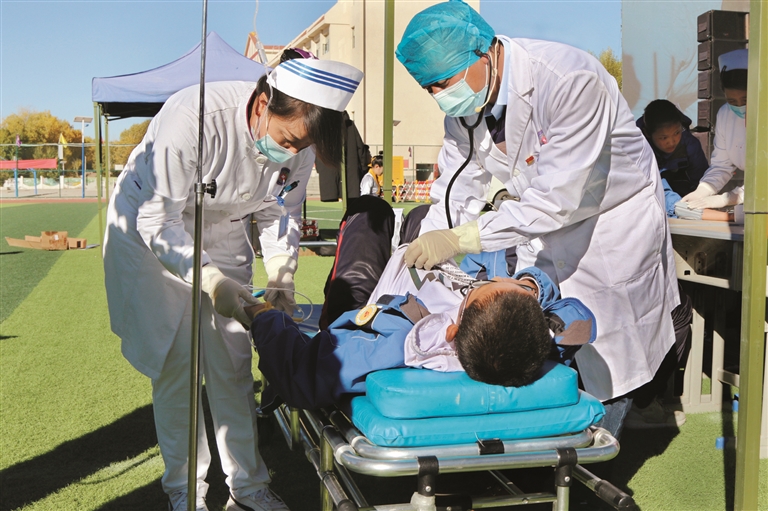 圖為在演練現(xiàn)場(chǎng),醫(yī)生正在對(duì)“中毒”學(xué)生進(jìn)行診療、救治。 拉薩融媒記者 龍俊霖?cái)z