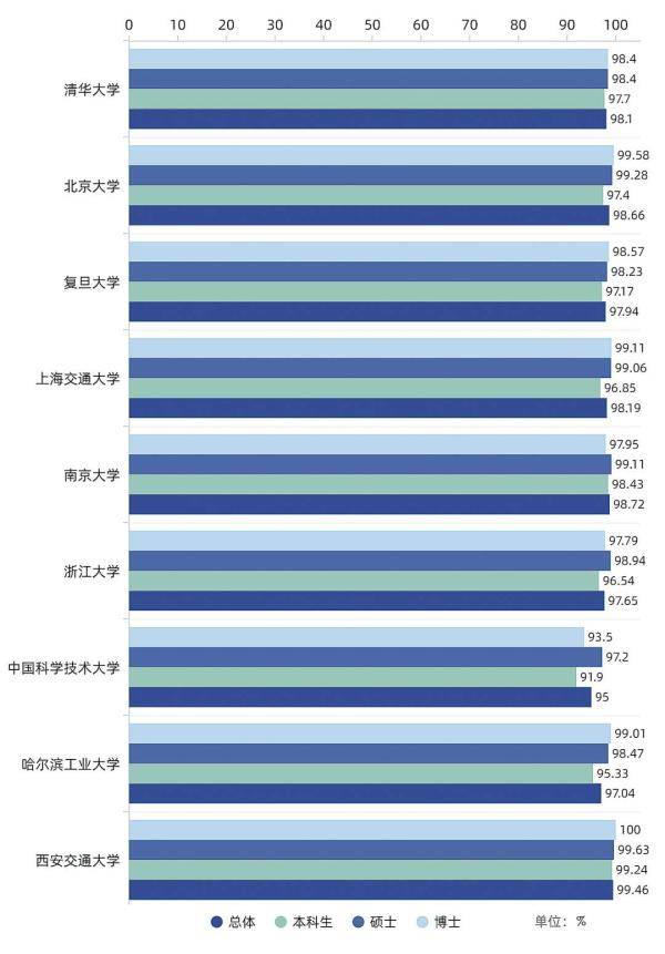 其中,最高的是西安交通大學(xué),畢業(yè)生就業(yè)率達99.46%;最低的是中國科學(xué)技術(shù)大學(xué),畢業(yè)生就業(yè)率為95%。