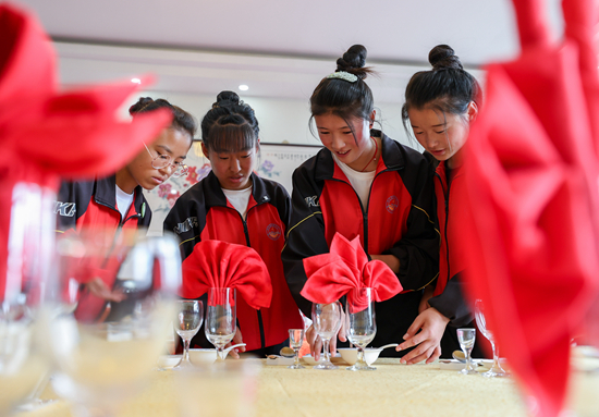 9月16日,寧夏西吉縣職業(yè)中學旅游服務與管理專業(yè)學生在學習中餐宴會擺臺實訓課程。新華社記者 楊植森/攝