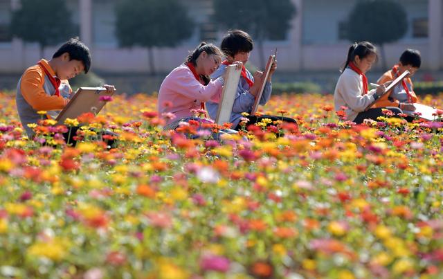 寨下鎮(zhèn)中心小學的學生們在花田寫生(11月9日攝)。新華社記者 彭昭之 攝